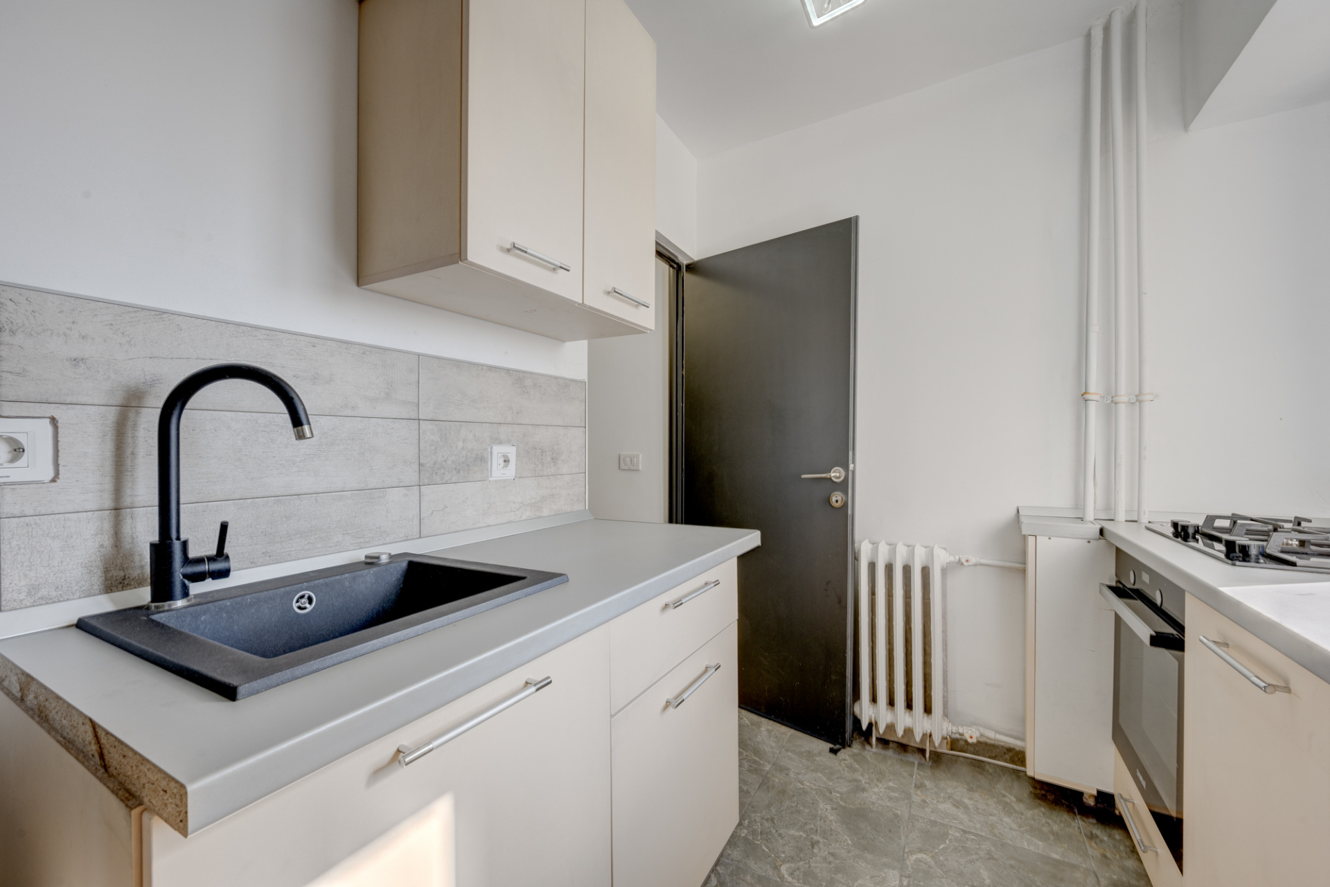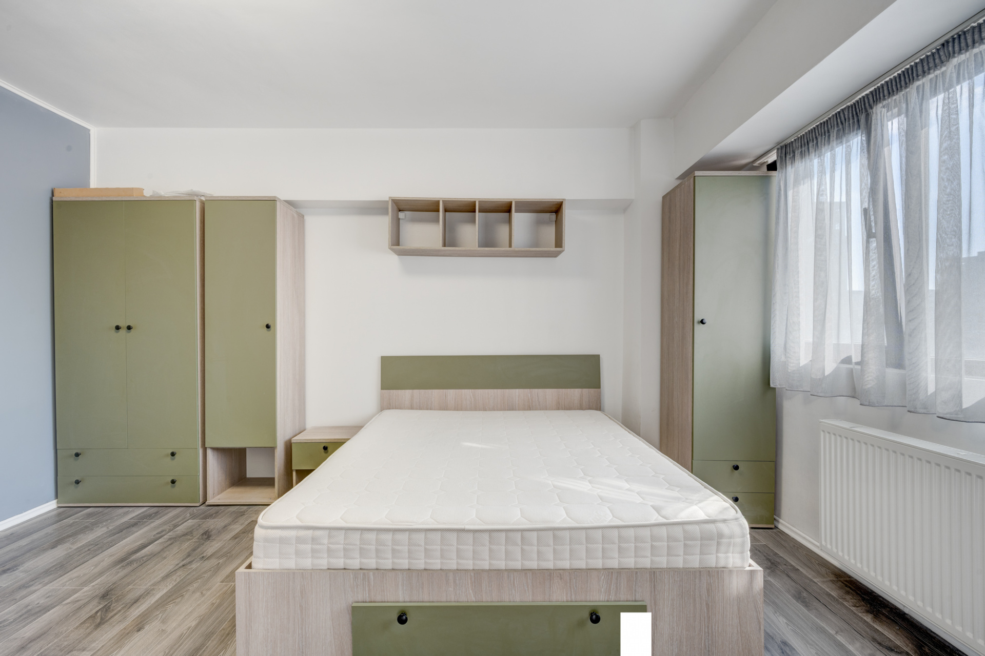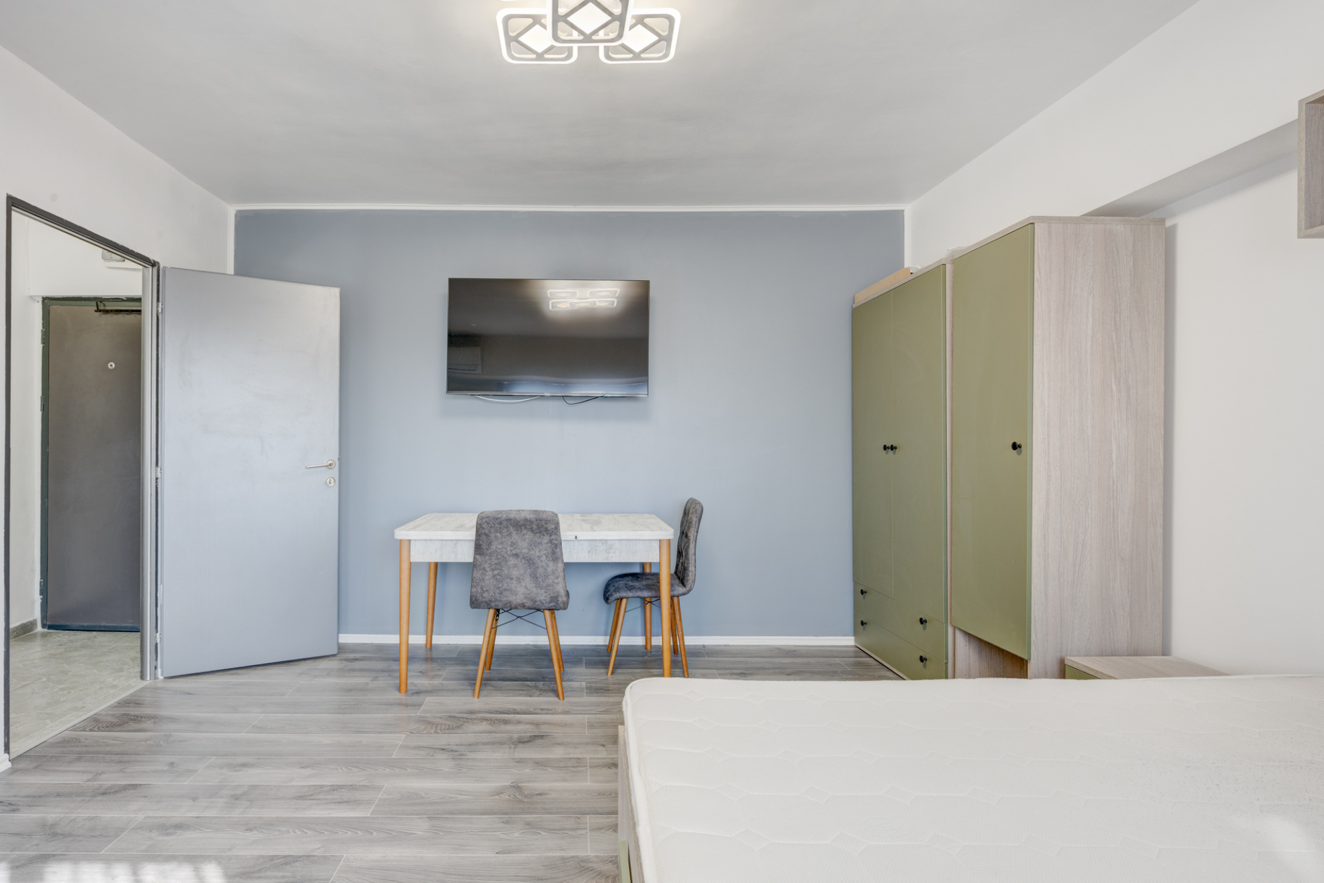Bucataria este mobilata si utilata cu plita, cuptor, frigider, masina de spalat rufe si uscator de rufe. Baia este amenajata cu cabina de dus si obiecte sanitare noi. Camera este mobilata cu pat matrimonial, dulapuri pentru haine si o zona de luat masa si TV. Pardoselile sunt placate cu parchet laminat in camera si gresie in hol, baie si bucatarie.