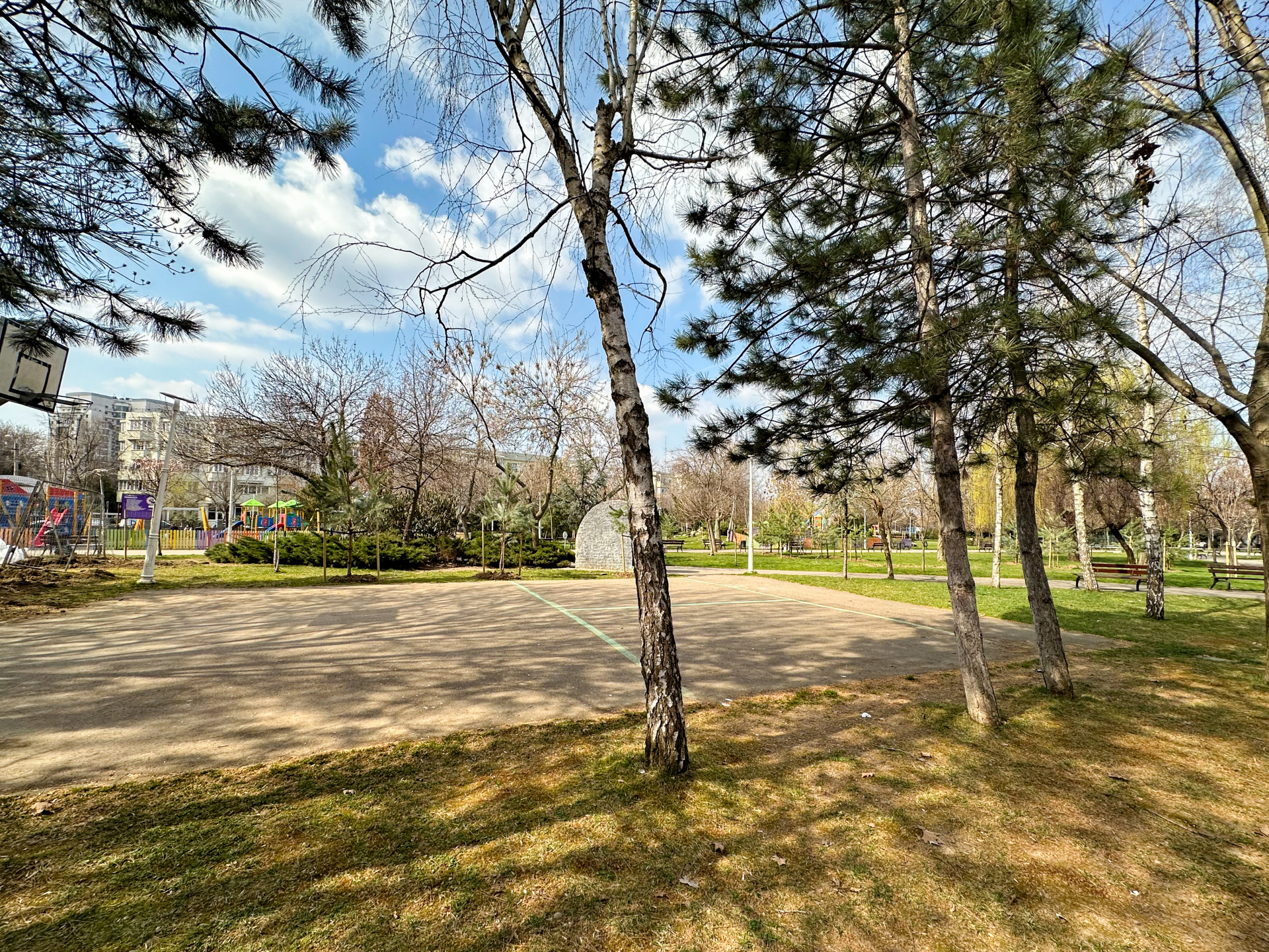 Și peste toate astea, parcul Lunca Florilor e în fața blocului — gardul lui e primul lucru pe care îl vezi când ieși. Strada Siliștea e liniștită, copaci maturi pe ambele părți și trafic aproape inexistent.