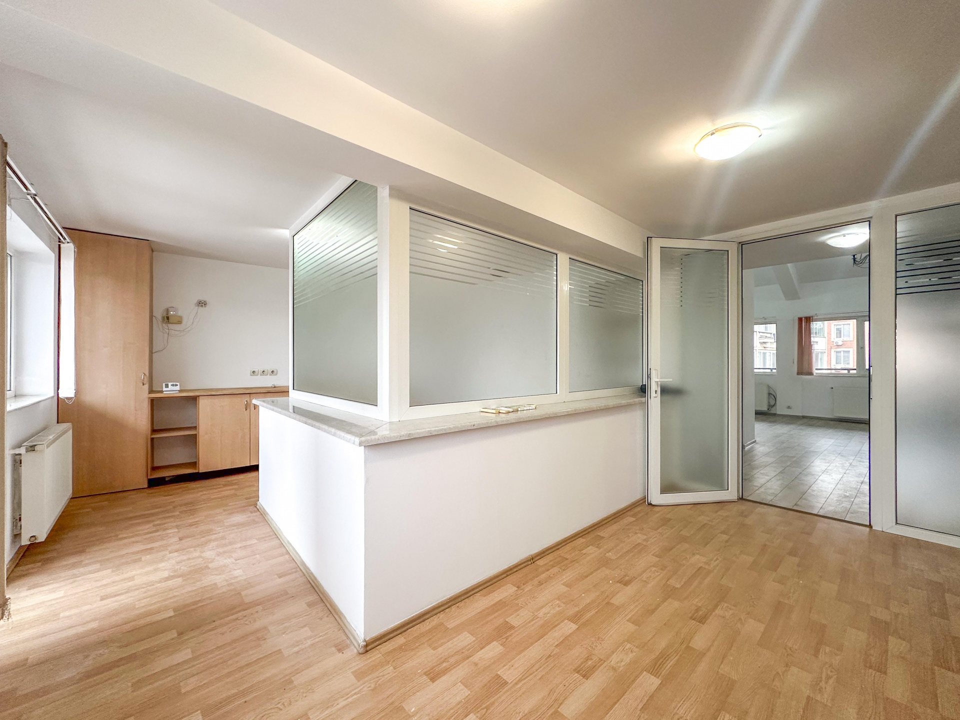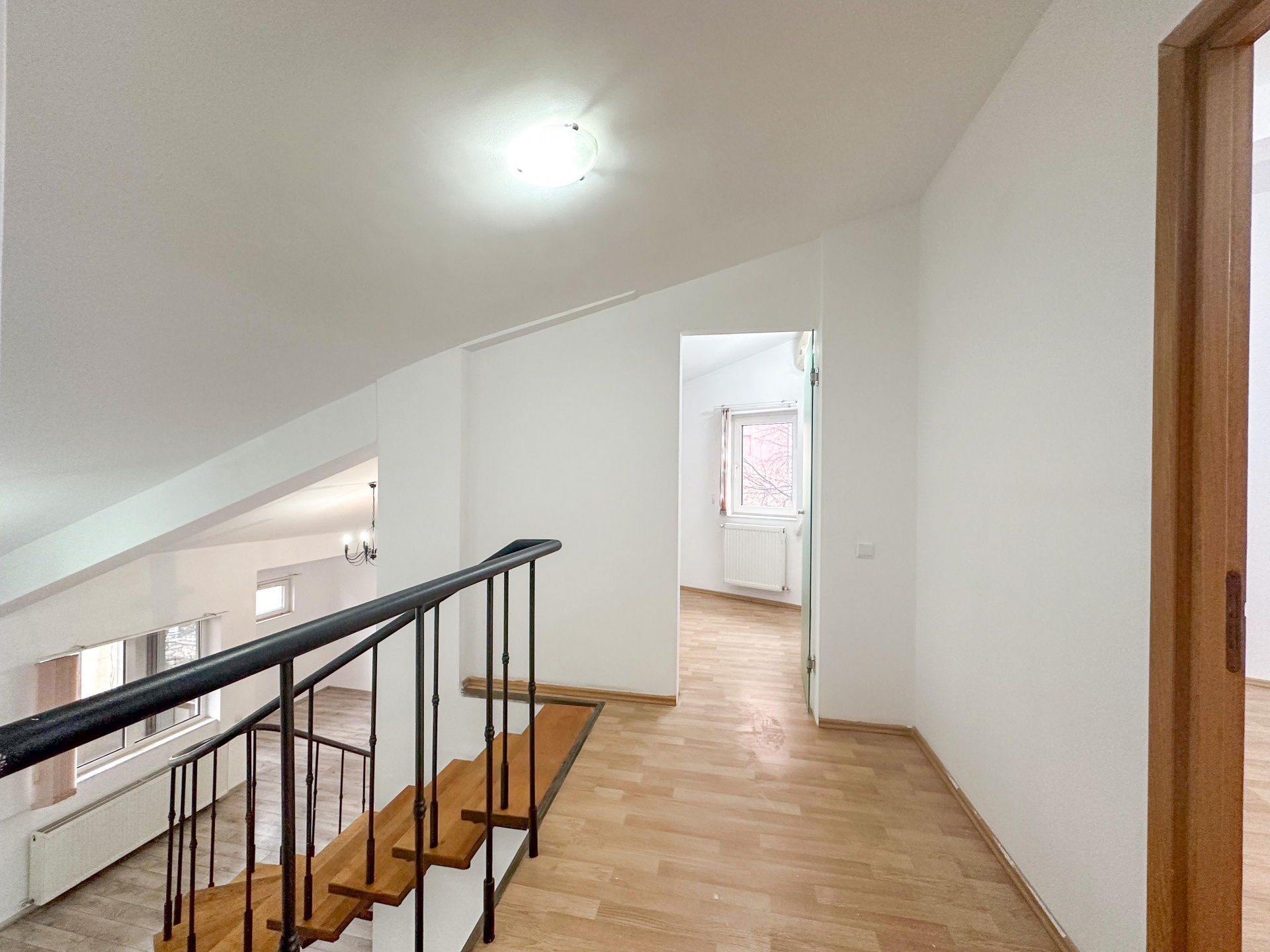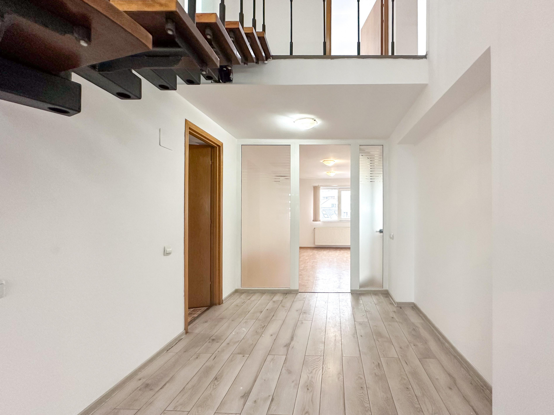 Nivelul superior, conectat printr-o scară interioară elegantă: 60 mp divizați inteligent în 3 birouri distincte – perfecte pentru departamente, meeting rooms sau spații private de concentrare. Două balcoane, baie – intimitate și funcționalitate acolo unde contează.